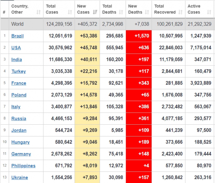 В общем пандемия уже унесла жизни 2 миллионов 734 тысяч человек. Количество тех, кто преодолел болезнь превысила 100 миллионов. Активными остаются более 21 миллиона случаев заболевания.