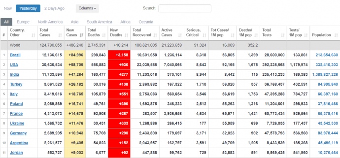 Украина, где 11 476 новых заражений, находится на 8 месте - между Францией (14 678) и Германией (10 943).
