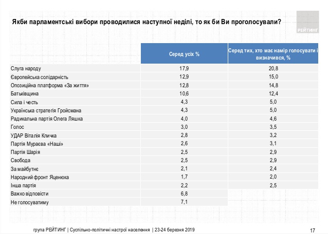 Дословно: "В парламентском рейтинге лидирует партия "Слуга народа" (20,8% среди тех, кто определился и намерен проголосовать)".