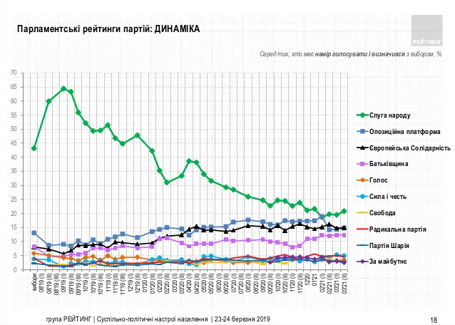 Если бы выборы в Верховную Раду состоялись в ближайшее время, то в парламент прошли бы шесть партий, при этом рейтинг лидеров немного вырос по сравнению с началом марта.