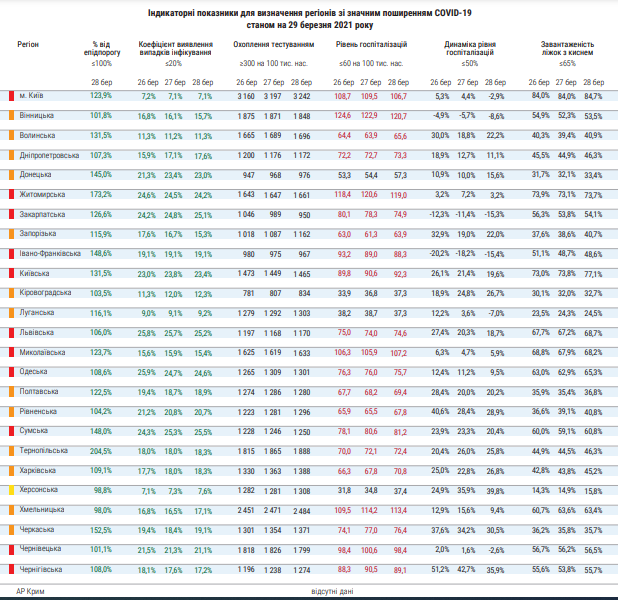 По состоянию на 29 марта в 10 областях и городе Киеве действует красный уровень эпидемической опасности.