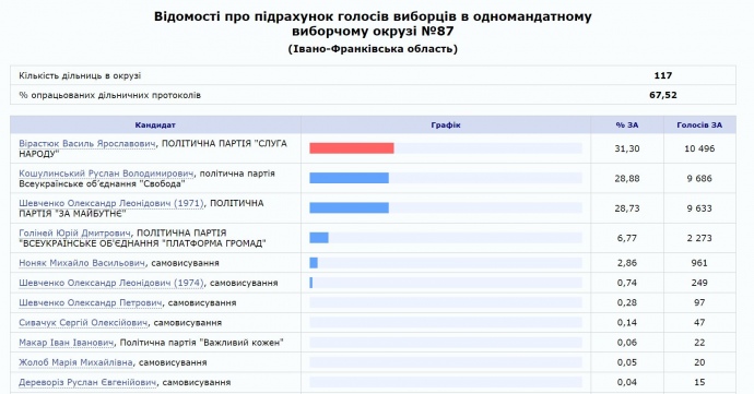 Детали: В округе №87 в Ивано-Франковской области в воскресенье 28 марта состоялись довыборы в парламент. По состоянию на утро 31 марта обработано 67,52% участковых протоколов. Пока результаты такие: Василий Вирастюк ("Слуга народа") – 31,3%, Руслан Кошулинский ("Свобода") – 28,88%, Александр Шевченко ( "За будущее") – 28,73%.