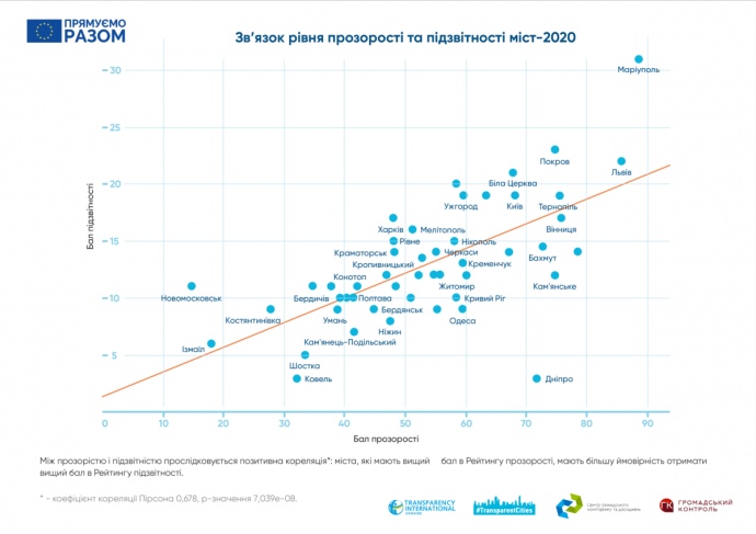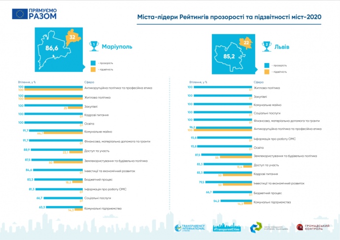 В 2020 году впервые за время измерения уровня прозрачности работы органов местной власти сразу два города попали в категорию "прозрачных" - это Мариуполь и Львов, набравшие 86,6 и 85,2 балла из 100.