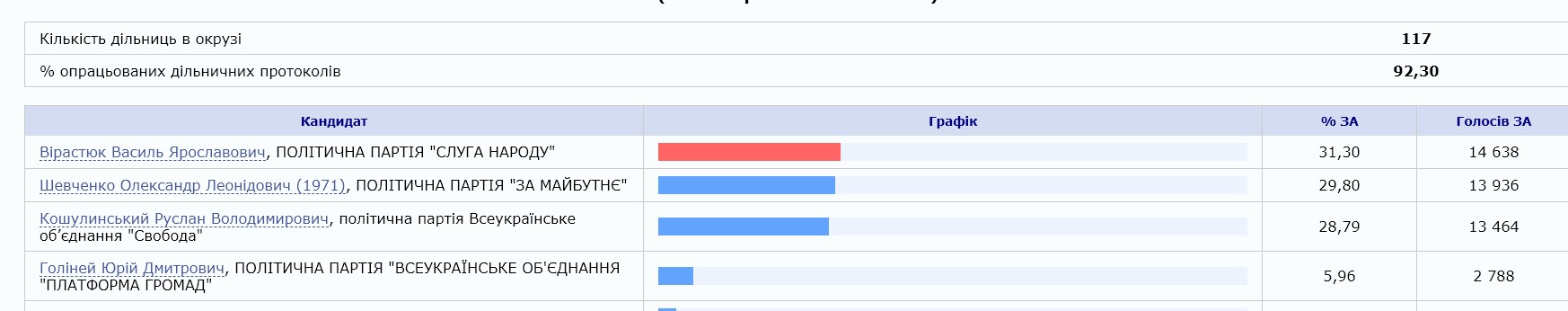 На первом месте остается представитель "Слуги народа" Василий Вирастюк с 31,3% поддержки. На 700 голосов от него отстает Александр Шевченко от "За будущее" - 29,8%.