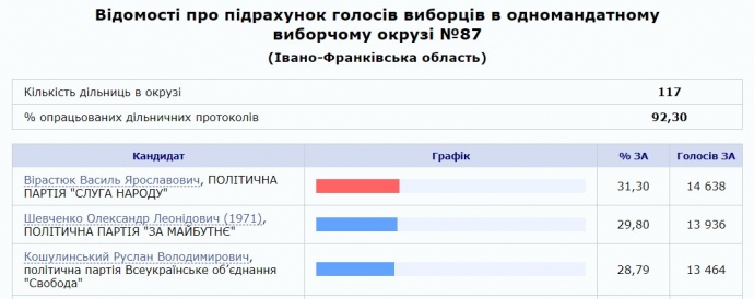 Между тем, разрыв между Вирастюком и Шевченко уменьшается. Сейчас между ними всего 702 голоса! Обработано 92,30% участковых протоколов".