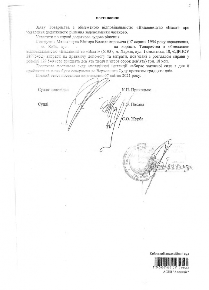 Вчера ситуация изменилась. Апелляционный суд удовлетворил заявление издательства Vivat и дополнительным постановлением взыскал с Медведчука 139,5 тыс. грн., потраченных Издательством на правовую помощь в апелляционной инстанции.
