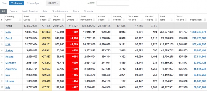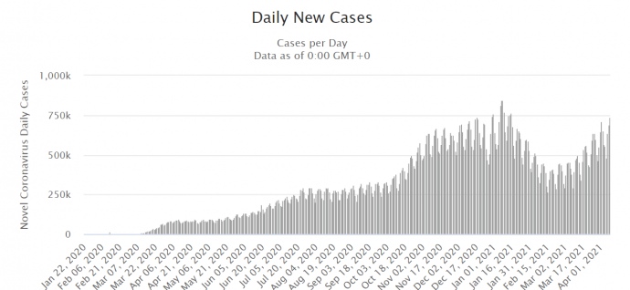 За сутки 7 апреля в мире зафиксировали 737 425 новых случаев COVID-19. Последний раз столь высокий показатель регистрировали 15 января, когда было 762,6 тысяч больных в сутки.