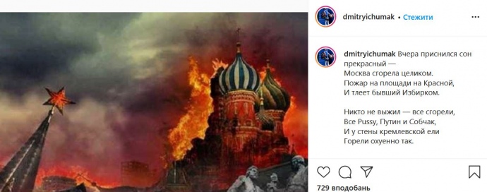 Чумак после победы опубликовал в Инстаграм картинку с горящим Кремлем и цитатой Сергея Шнурова о Москве.