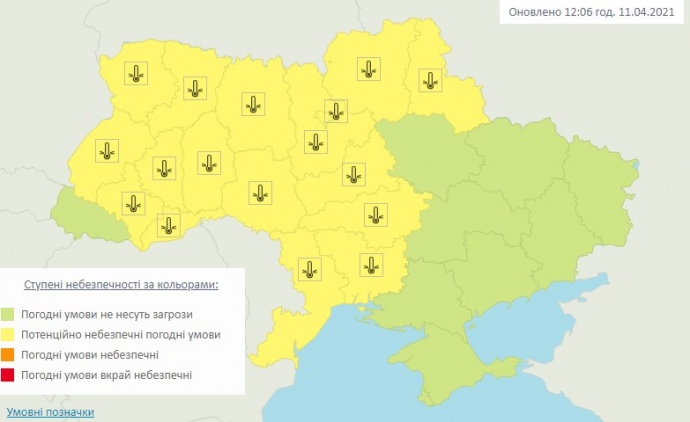 Дословно: "12 апреля ночью в Украине, кроме юго-восточной части, на поверхности почвы заморозки 0-5° (1 уровень опасности, желтый)".