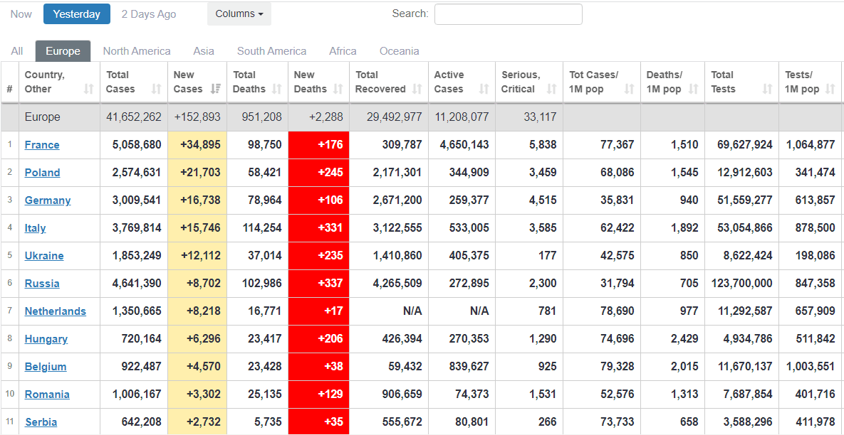 Украина по количеству новых заражений находится на 12 месте в мире с 12 112 случаями - между Аргентиной (15 262) и Филиппинами (11 681). По этому показателю среди европейских стран Украина - на 5 месте.