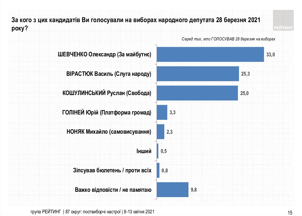 По крайней мере 33% опрошенных говорили, что голосовали за Шевченко, порядка по 25% – что за Вирастюка и Кошулинского.