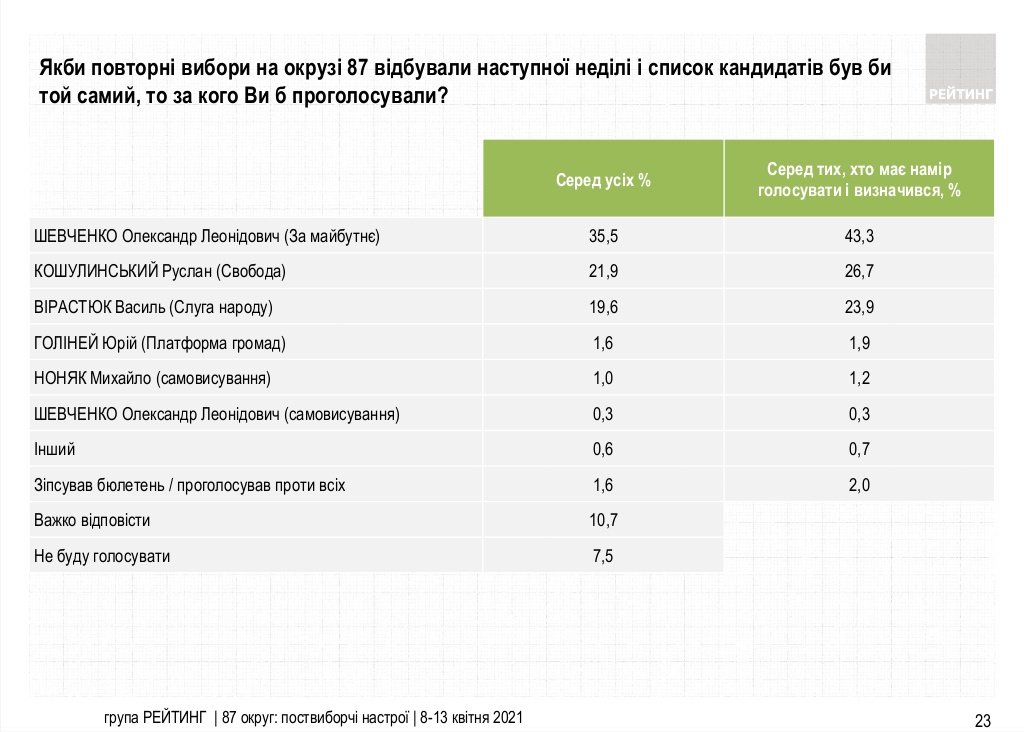 Если бы повторные выборы на округе состоялись в ближайшее воскресенье, то 43,3% тех, кто определился и намерен прийти на них, проголосовали бы за Шевченко, 26,7% – за Кошулинского, 23,9% – за Вирастюка. Других кандидатов, участвовавших в выборах 28 марта, поддержали бы менее 2% опрошенных.