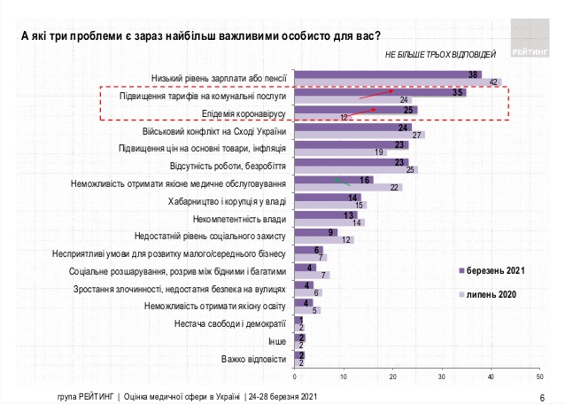 Эпидемию коронавируса личной проблемой считают 25%, войну на востоке Украины – 24%, повышение цен на основные товары и услуги – 23%, отсутствие работы – 23%, невозможность получить качественное медобслуживание – 16%, взяточничество и коррупцию во власти – 14%, некомпетентность власти – 13%.
