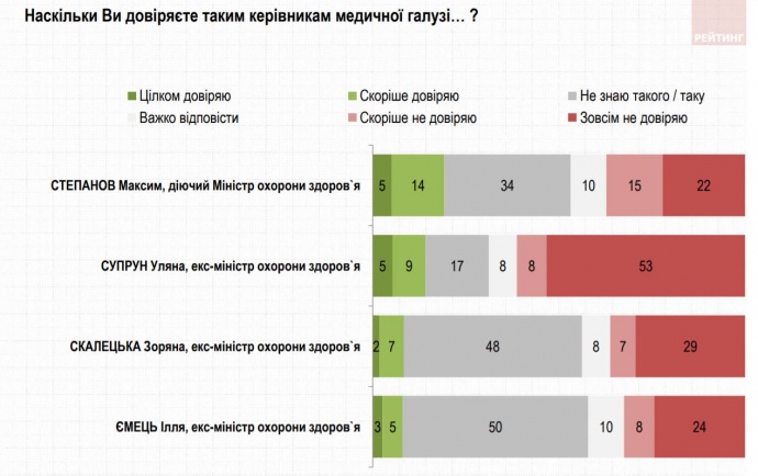По результатам социологического исследования, украинцы преимущественно не доверяют или не знают бывших министров здравоохранения, а действующему главе министерства Максиму Степанову доверяют только 19% украинцев.