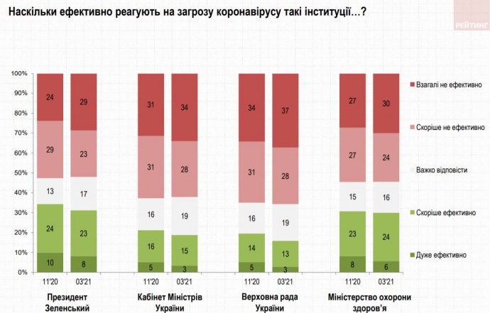 Детали: Более половины опрошенных считают что Минздрав и президент Владимир Зеленский неэффективно реагируют на угрозу коронавируса, а 30% считают, что эффективно.