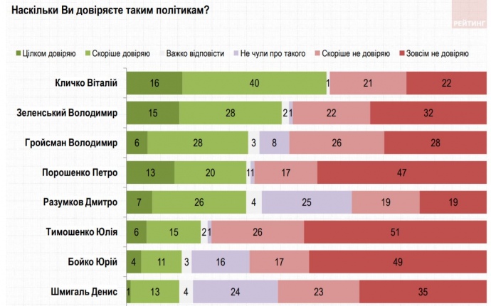 Бывшему президенту Петру Порошенко доверяют 33%, не доверяют - 64%. Председателю Верховной Рады Дмитрию Разумкова доверяют - 33%, не доверяют - 38%, не знают его - 25%.