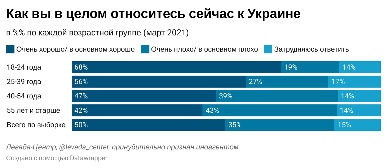 Детали: Согласно ответам людей, в феврале 55% россиян относились к Украине хорошо, а 31% – плохо, то в марте эти показатели составили 50% и 35% соответственно.