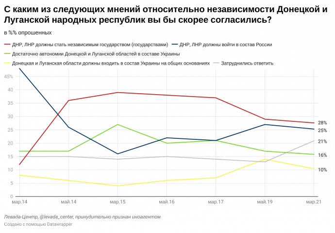 28% россиян считают, что так называемые "ДНР" и "ЛНР" должны стать независимыми государствами, ещё четверть (25%) выступает за то, чтобы оккупационные "республики" вошли в состав России. Всего 10% - за возвращение в состав Украины на условиях областей.