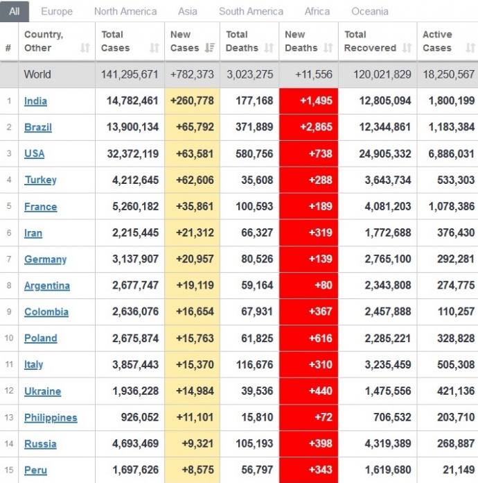 Детали: В частности, в Индии зафиксировали более 260 000 новых заражений, в Бразилии - более 65 000, в США - более 63 000 случаев.