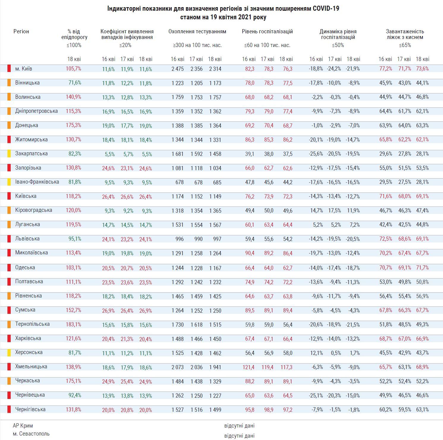 Самый высокий показатель госпитализаций по состоянию на 18 апреля в Хмельницкой области (117,3 на 100 000 населения), Черниговской (97,2), Сумской (89,4) и Черкасской (89,1) областях.