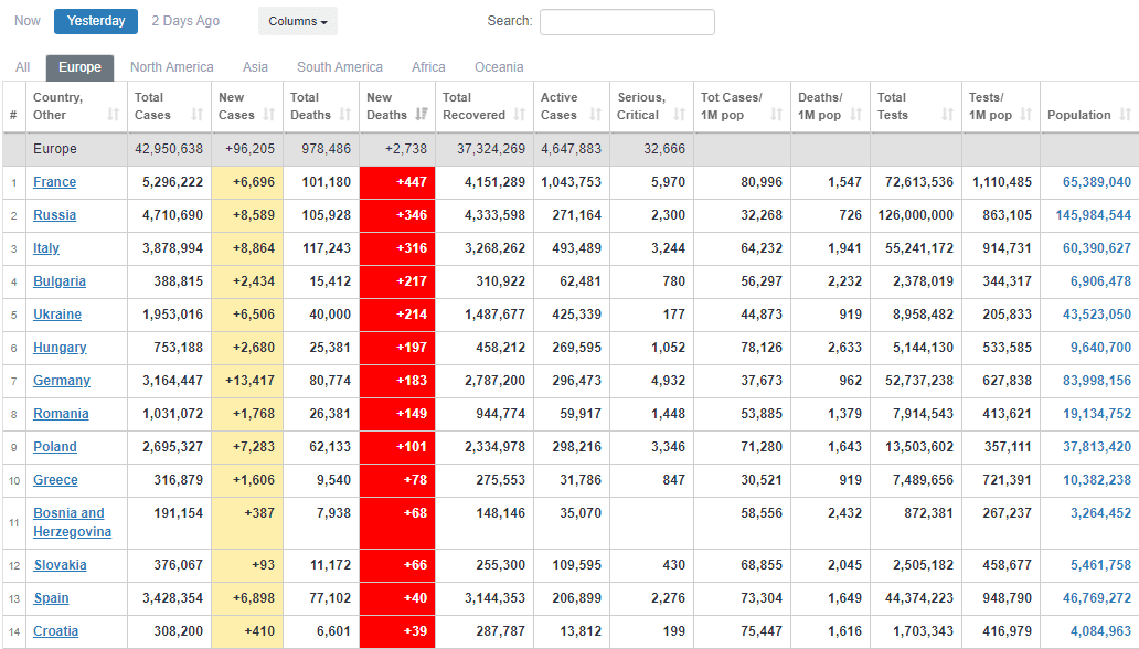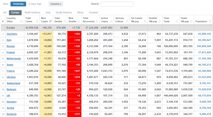 Умерли за сутки 9 813 человек. По ежедневному количеству погибших Украина 13-я в мире и 5-в Европе.