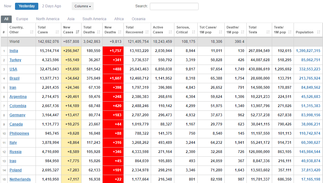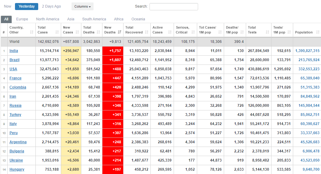 Детали: В частности, в Индии - 256 947 новых больных, 55 149 - в Турции, 51 650 - в США.