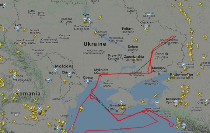 Также беспилотник пролетел над Николаевом и, не долетая до Мариуполя, повернул на север. Затем он пролетел над Краматорском, Славянском и вернул над Песками.