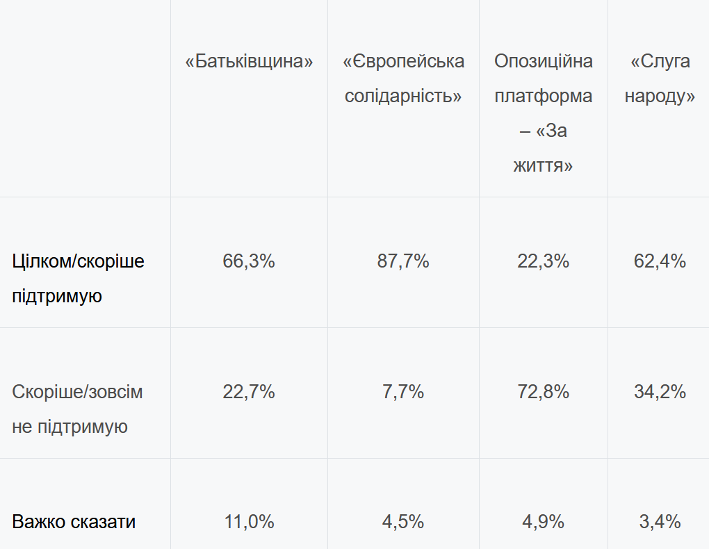 В электоральном разрезе больше всего сторонников этого решения среди избирателей "Батькивщины" и "Европейской солидарности". Среди избирателей "Слуги народа" 62% поддерживают, 34% - нет. Основной "донор" противников этого решения - избиратели "Оппозиционной платформы - За жизнь".