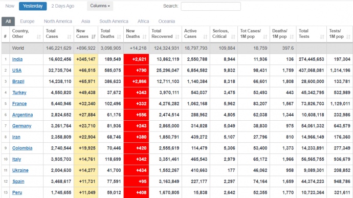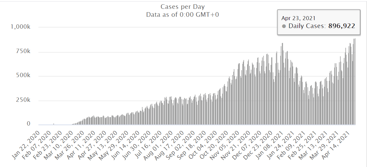 За сутки 22 апреля в мире обнаружили 896 922 новых случая COVID-19 - рекордное ежедневное количество за время пандемии.