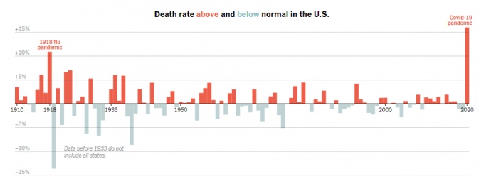 Всплеск смертности в США в 2020 году был самым высоким, чем когда-либо зарегистрированный в стране - превысив показатель во время пандемии испанского гриппа 1918 года.