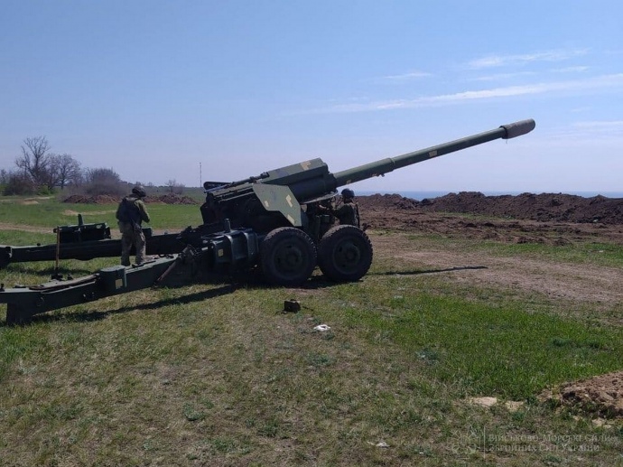 Дословно: "В Одесской и Николаевской областях подразделения отдельной артиллерийской бригады имени генерал-хорунжего Алексея Алмазова Командования морской пехоты ВМС ВСУ провели тактико-специальные занятия по приведению подразделений в боевую готовность. Артиллеристы тренировались выполнять задания при условии ведения боевых действий при обороне морского побережья".