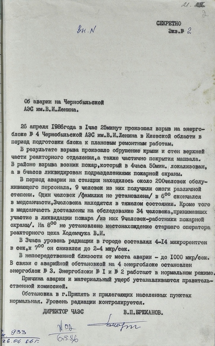 Так, архивные дела свидетельствуют, что аварии на ЧАЭС случались и до 26 апреля 1986 года. Например, в 1982 году на 1 энергоблоке произошел значительный выброс радиоактивных веществ. Но доклад КГБ об этом заканчивается привычным "приняты меры для недопущения панических и провокационных слухов". В 1984 году аварийные ситуации были на 3 и 4 энергоблоках.
