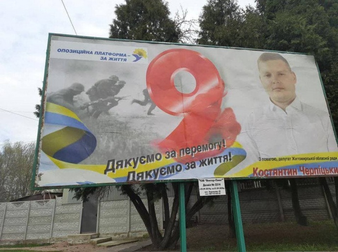 Депутат облсовета от партии кума Путина Медведчука повесил в Житомире поздравительные билборды по случаю 9 мая, на которых изображены солдаты гитлеровской Германии, а под ними надпись "Спасибо за победу".