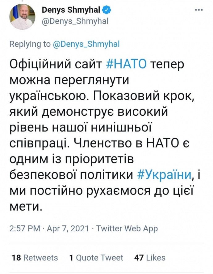 Шмыгаль заметил переход сайта НАТО на украинский язык с опозданием на 12 лет