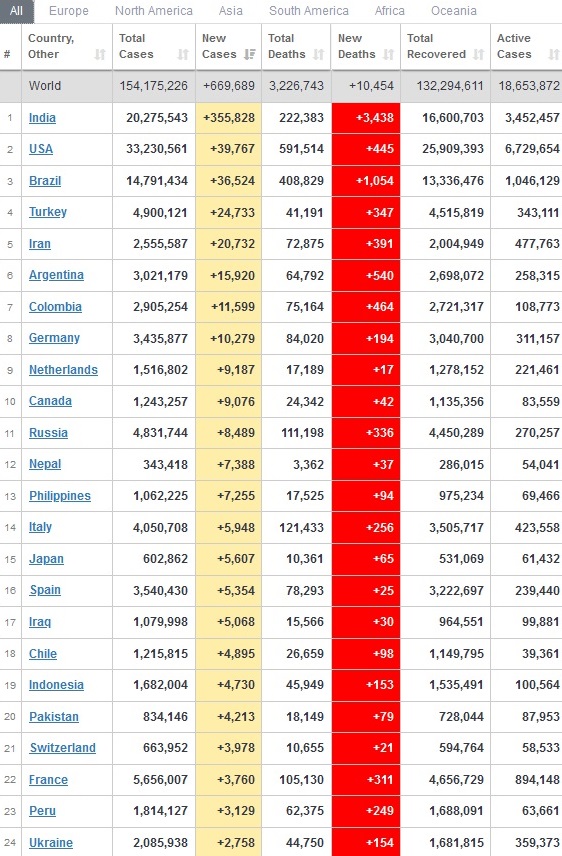 За минувшие сутки в мире диагностировали более 669 000 новых случаев заболевания коронавирусом. Больше всего больных обнаружили в Индии, США и Бразилии, Украина занимает 24 место в мире, 8 в Европе.