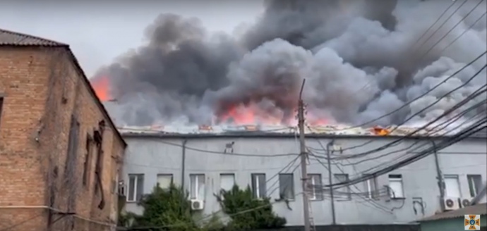 В Виннице по улице Бевза, 34 загорелась офисное здание. Из-за большой площади пожара и сильного ветра огонь быстро распространяется по крыше сооружения на складские помещения.