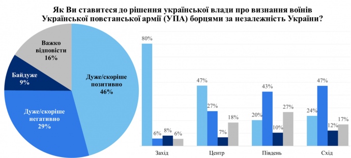 46% украинцев положительно относятся к решению украинских властей о признании воинов Украинской повстанческой армии борцами за независимость Украины. В то же время деятельность Степана Бандеры как исторической фигуры положительной для Украины считают лишь 32% граждан.