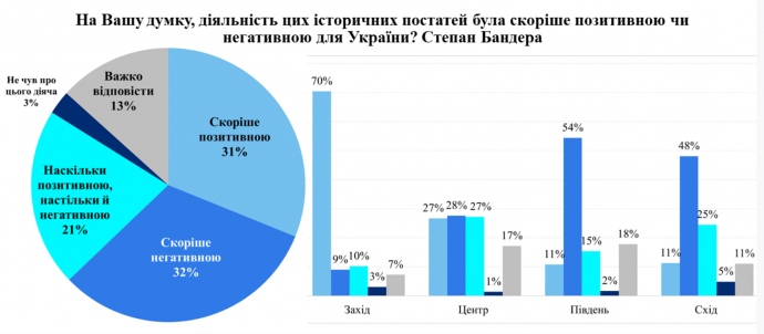 Положительное отношение преобладает в Западном регионе (70%). В Центральном регионе по 27% считают деятельность положительной или отрицательной, и также еще 27% - насколько положительной, настолько и отрицательной. Негативное отношение преобладает в Южном и Восточном регионах, здесь деятельность Степана Бандеры считают отрицательной для Украины 54% и 48% соответственно, а положительной - по 11% в обоих регионах. Существенная доля жителей Юга и Востока считают деятельность Бандеры насколько положительной, настолько и отрицательной (15% и 25% соответственно).