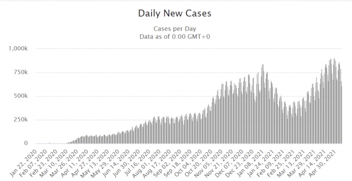 За сутки 9 мая в мире зафиксировали 611 096 новых случаев COVID-19 - это самый низкий показатель с 12 апреля, когда за день регистрировали 591 287 больных.