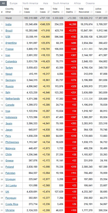 За минувшие сутки в мире диагностировали более 707 000 новых случаев заболевания коронавирусом. Больше всего больных обнаружили в Индии, Бразилии, США. Украина занимает 31 место в мире и 10 в Европе.