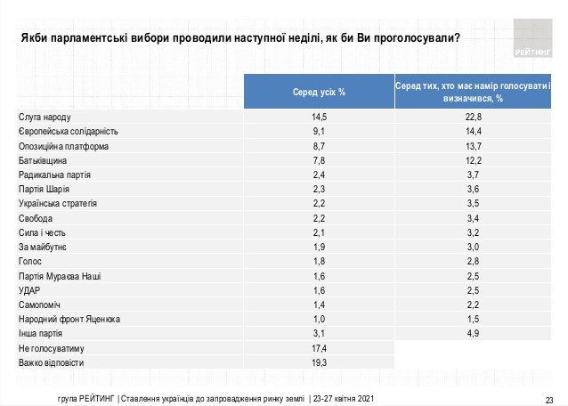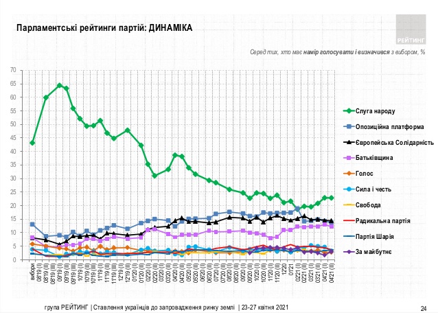 - Согласно мартовскому опросу "Рейтинга", в Раду проходили 6 партий: "Слуга народа" (20,8% среди тех, кто определился и намерен проголосовать)", "Европейская солидарность" (15%), "Оппозиционная платформа – За жизнь" (14,8%), "Батькивщина" (12,4%), "Сила и честь" (5%) и "Украинская стратегия Гройсмана" (5%).