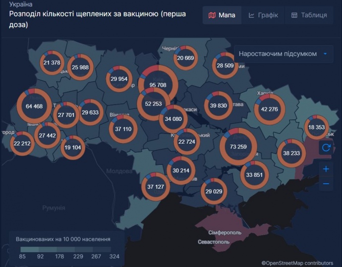 По прививкам первой дозой вакцины лидирует Киев (95 708), Днепропетровская (73 259) и Львовская (64 468) области.