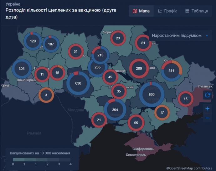 Лидерами в вакцинации второй дозой являются Днепропетровская (860), Винницкая (630) и Николаевская (354) области.