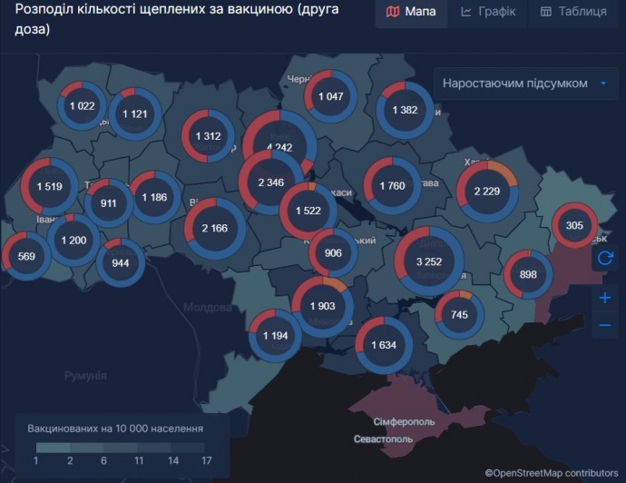 В Украине уже 957 346 человек получили первую дозу вакцины против коронавируса SARS CoV 2, а 37 526 человек получили обе дозы вакцины.