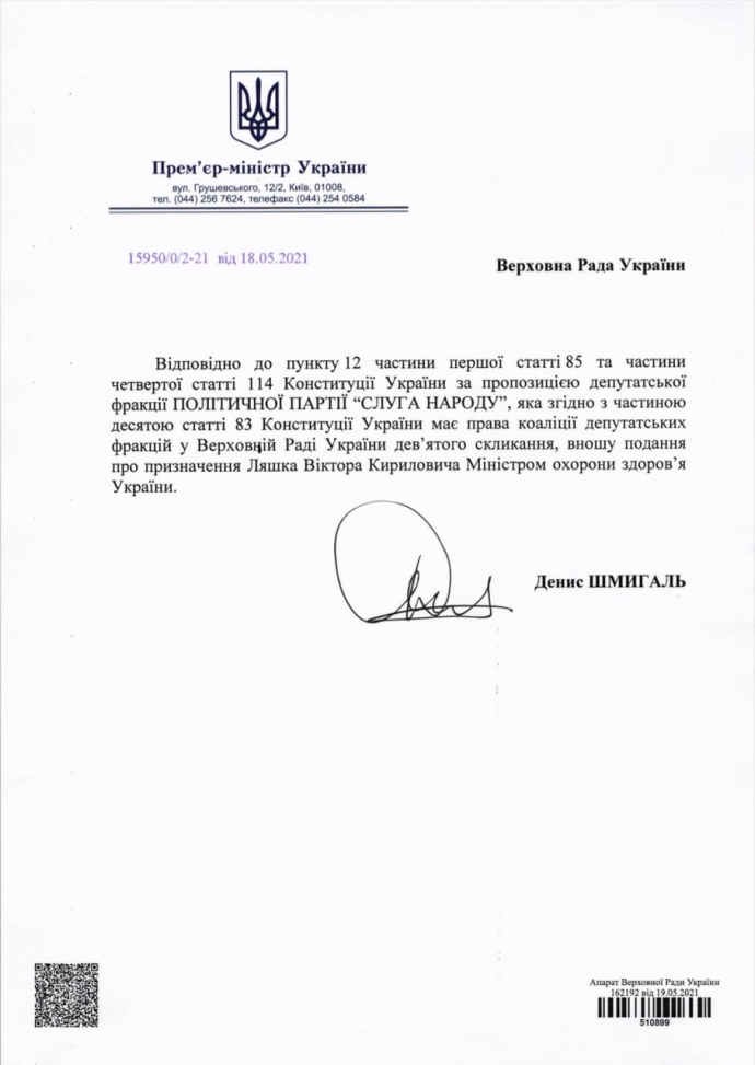 В Верховную Раду поступило представление от фракции "Слуга народа" о назначении министром здравоохранения главного санитарного врача страны Виктора Ляшко.