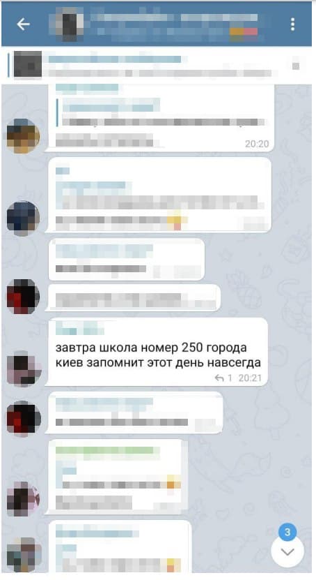 Детали: При анализе содержания переписки между участниками в чате правоохранители обнаружили размещенное в 20:21 сообщение следующего содержания: "Завтра школа номер 250 города Киев запомнит этот день навсегда".