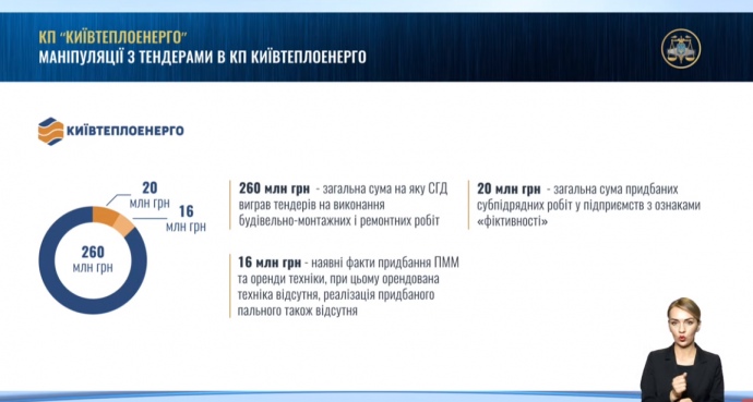 Киевтеплоэнерго - я взял один пример, когда был проведен тендер на строительно-монтажные ремонтные работы. Из перечисленных 260 млн грн сразу 16 млн были перечислены на предприятие, которое не имеет возможности делать эти работы. 20 млн отправлены на предприятия фиктивные".