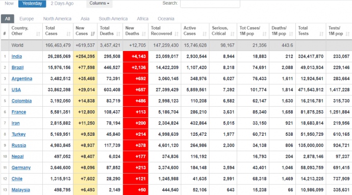 Детали: В частности, в Индии - 254 395 новых случаев, в Бразилии - 77 598 случаев, в Аргентине - 35 468.