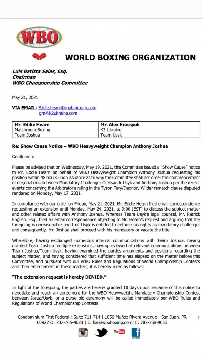 Всемирная боксерская организация (WBO) официально санкционировала бой между украинцем Александром Усиком и чемпионом WBA, IBF, WBO и IBO в супертяжелом весе Джошуа.