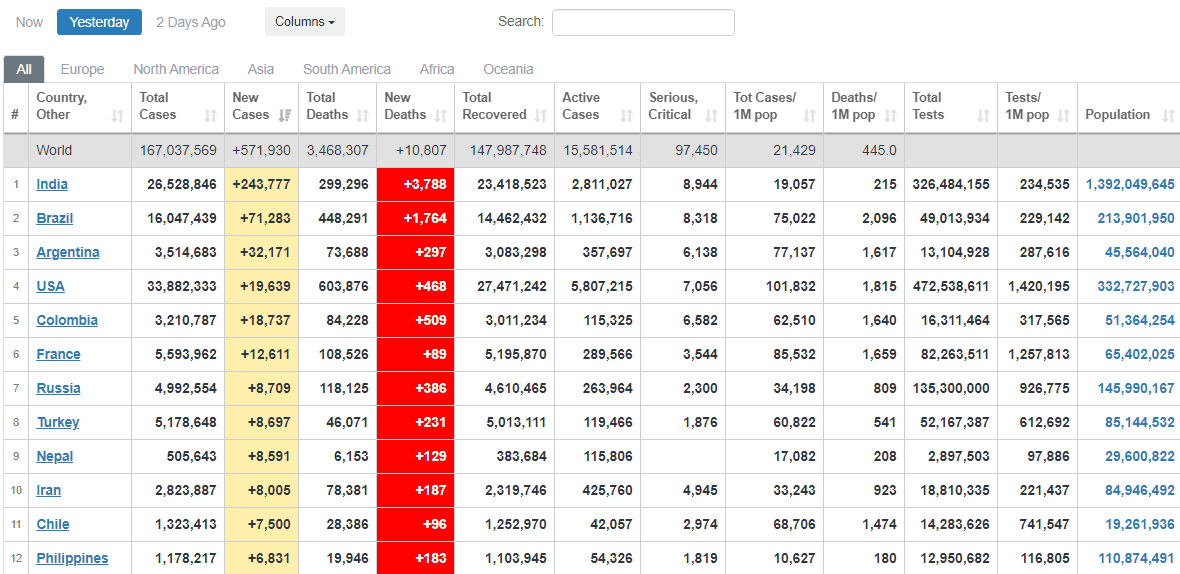 Детали: В частности, в Индии - 243 777 случаев, в Бразилии - 71 283, в Аргентине - 32 171.